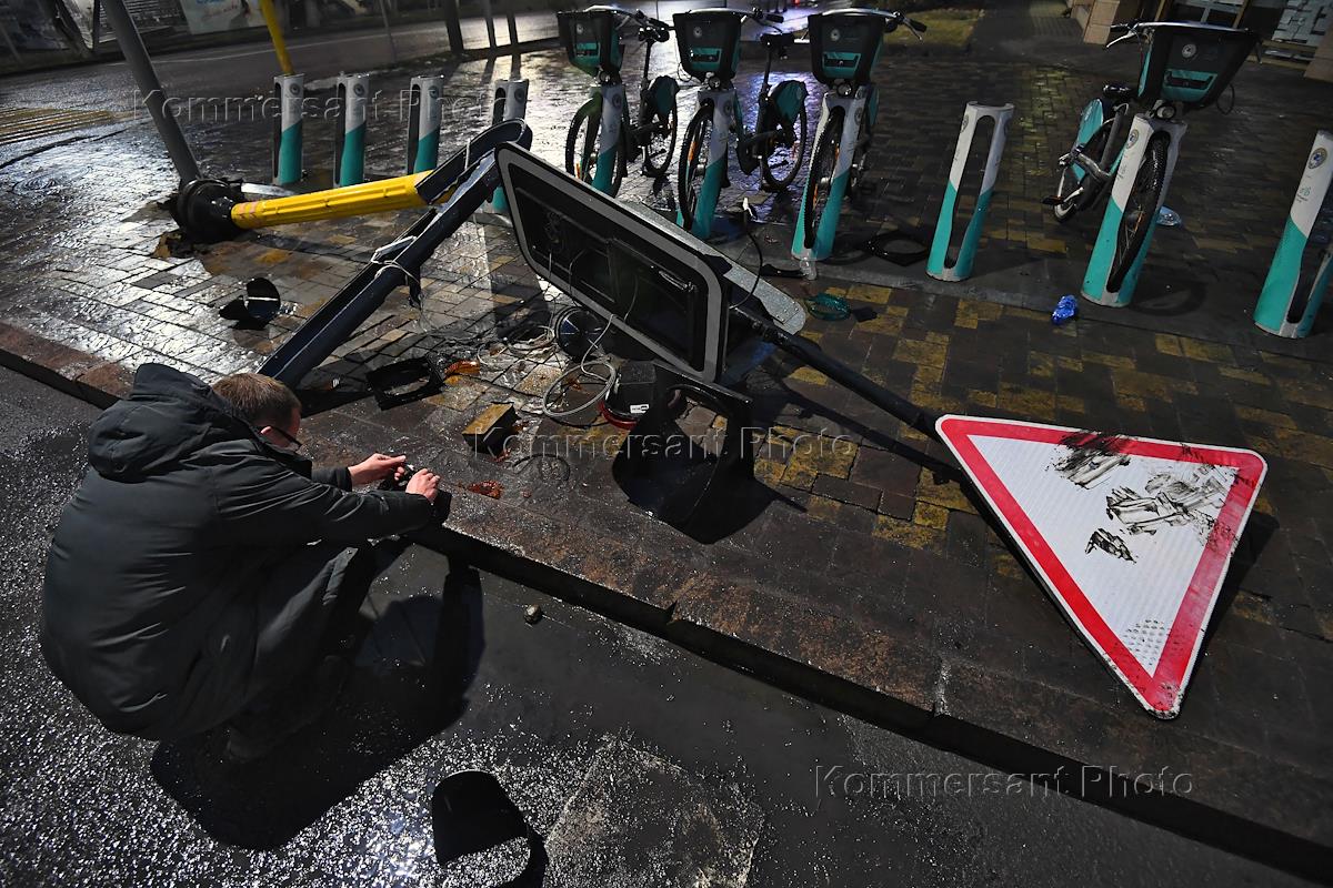 Политическая обстановка в Казахстане. Массовые акции, вызванные ростом цен на топливо. Жанровая фотография. Сбитый дорожный знак "Уступите дорогу" у велопарковки.