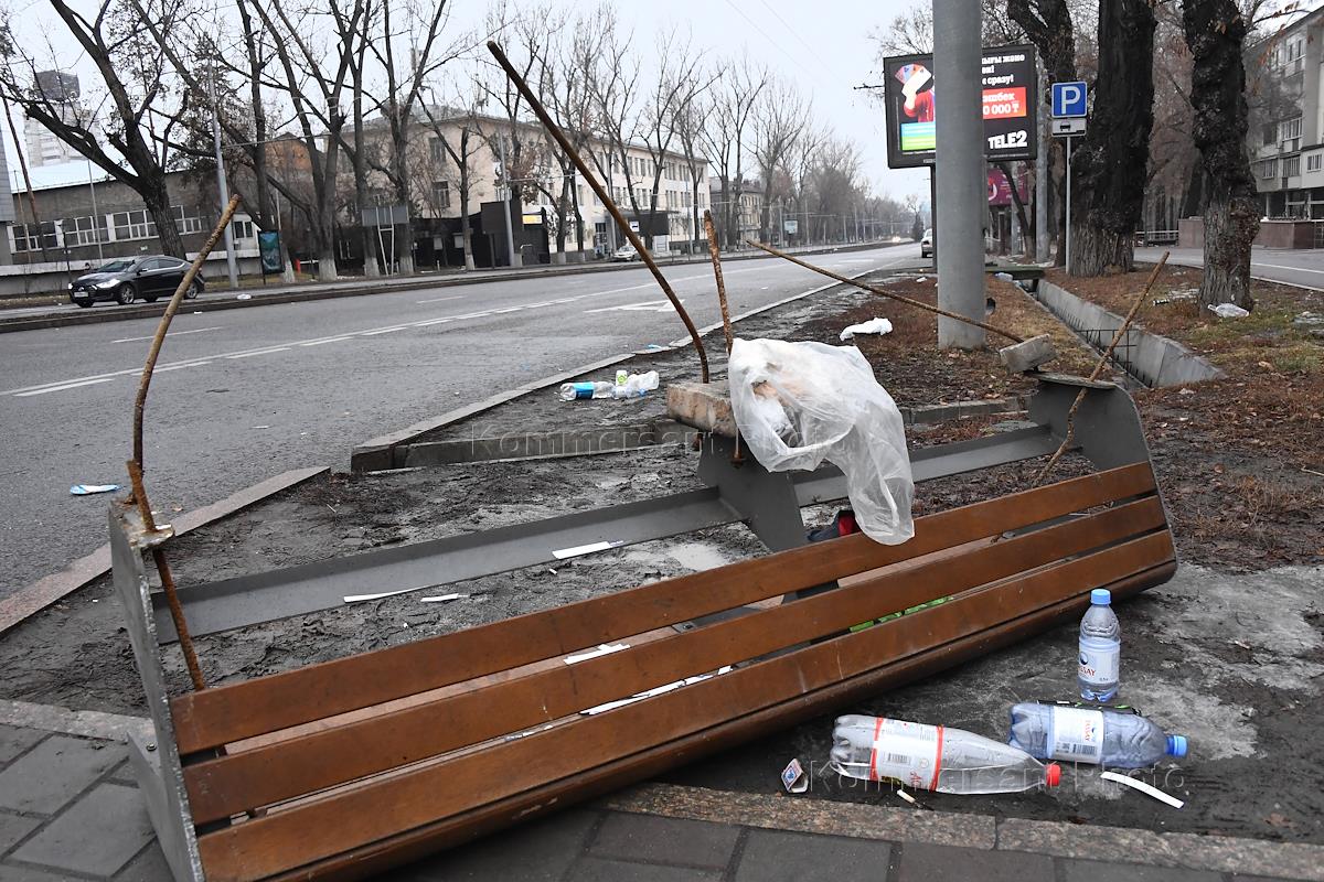 Политическая обстановка в Казахстане. Массовые акции, вызванные ростом цен на топливо. Жанровая фотография. Поломанная, перевернутая скамейка на улице города.