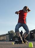 Молодой человек катается на роликовых коньках на стадионе имени Кирова.