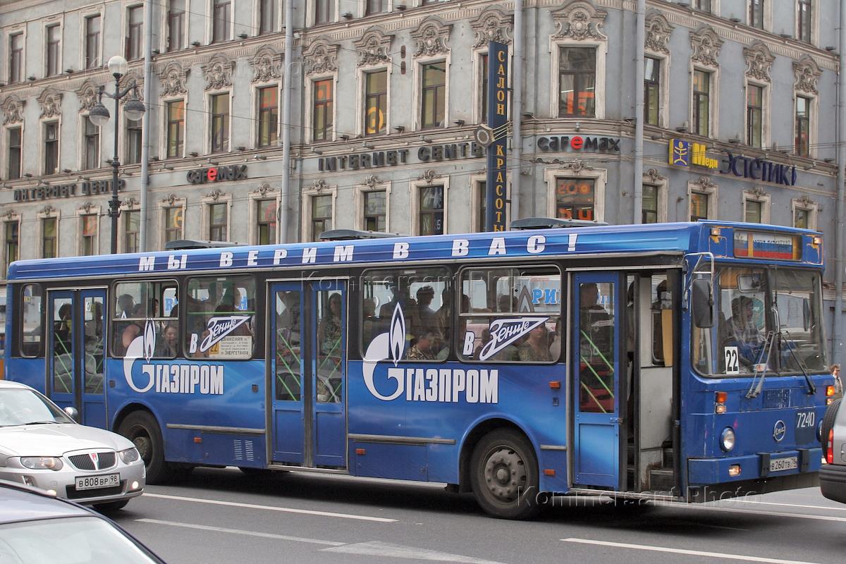 Городской рейсовый автобус с изображением рекламы "Газпрома" и футбольной команды "Зенит" (Санкт-Петербург) на салоне едет по центральной улице города. Надпись "Мы верим в вас!".
