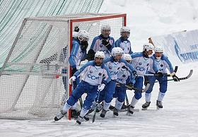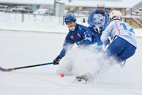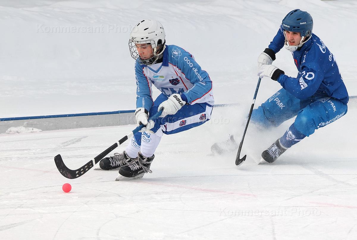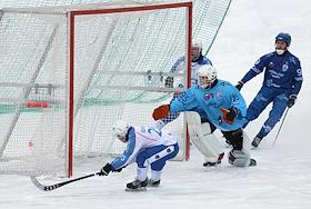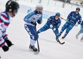 Чемпионат России по хоккею с мячом. Матч между командами "Динамо" (Москва) и "Сибсельмаш" (Новосибирск) на стадионе "Зоркий".