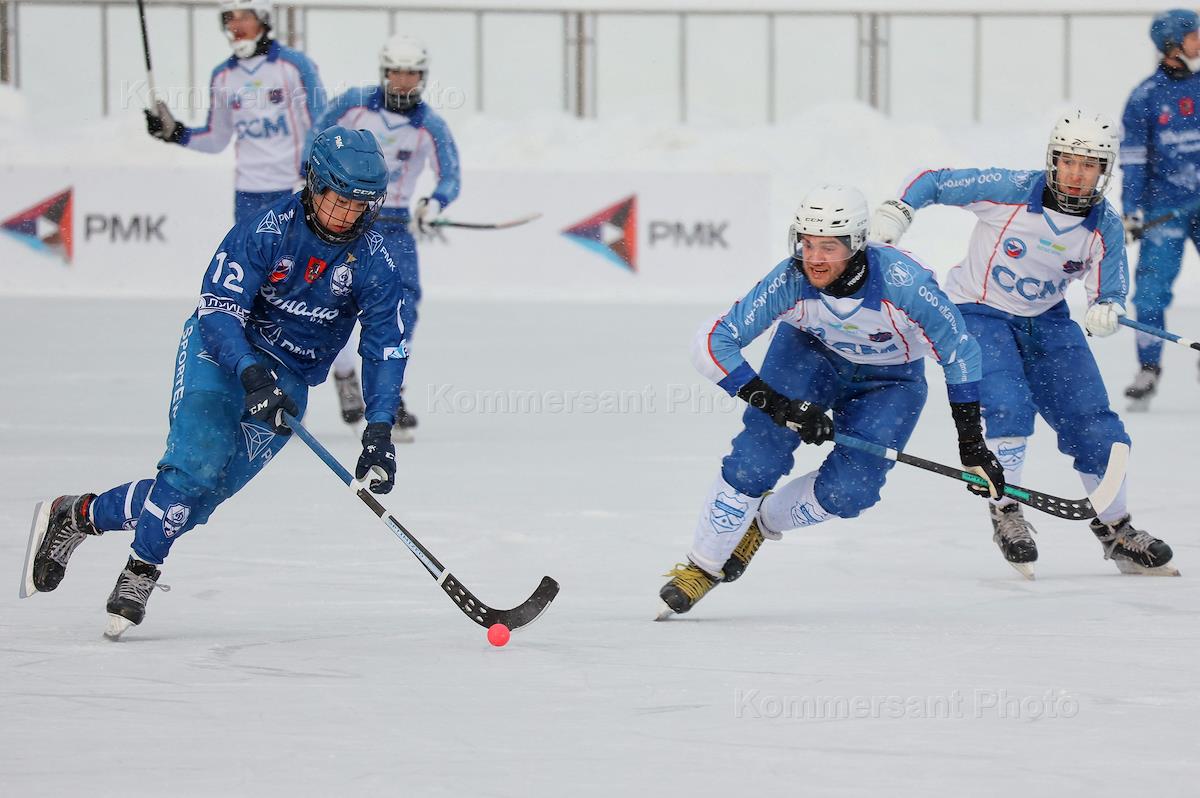 Чемпионат России по хоккею с мячом. Матч между командами "Динамо" (Москва) и "Сибсельмаш" (Новосибирск) на стадионе "Зоркий".