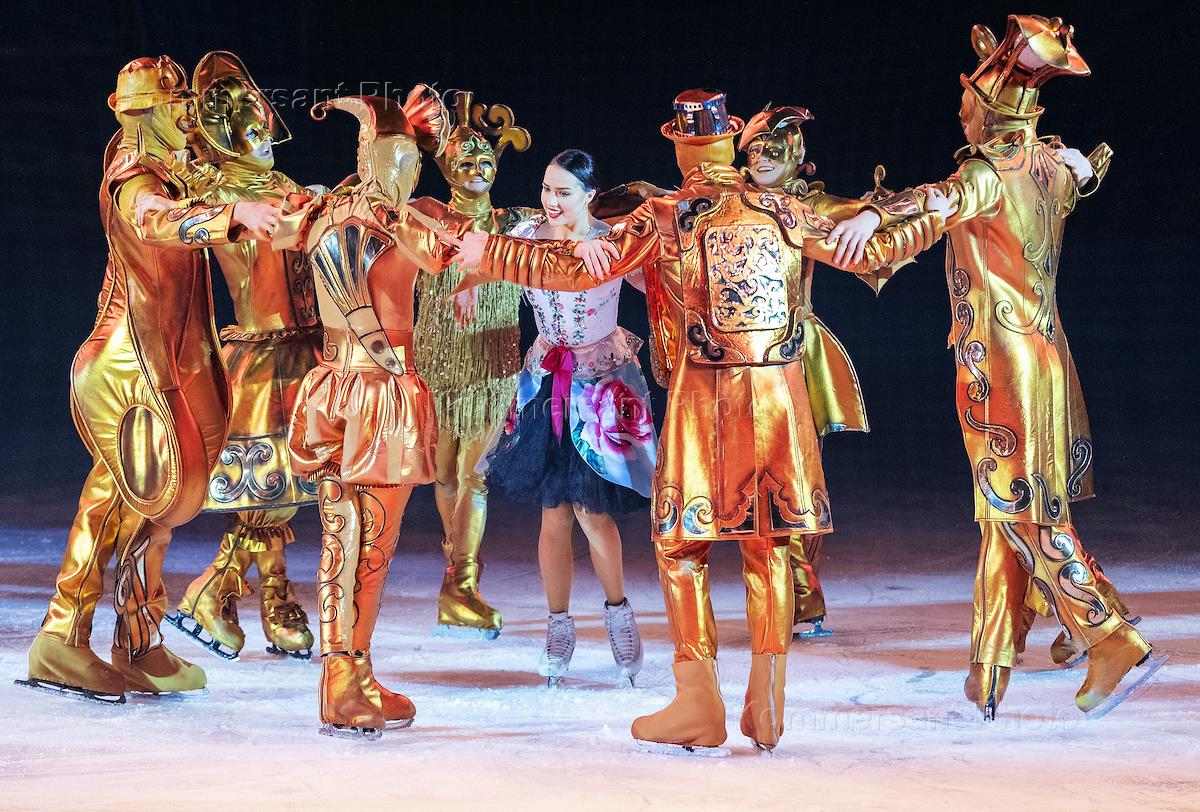 Ледовое шоу олимпийской чемпионки Татьяны Навки "Аленький цветочек" в спортивном комплексе "Юбилейный". Олимпийская чемпионка Алина Загитова (в центре) во время выступления на шоу.
