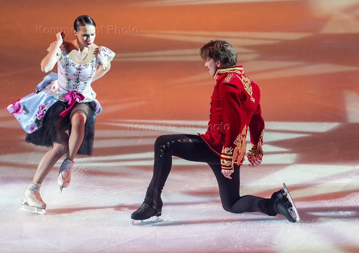 Ледовое шоу олимпийской чемпионки Татьяны Навки "Аленький цветочек" в спортивном комплексе "Юбилейный". Олимпийские чемпионы Алина Загитова (справа) и Дмитрий Соловьев (слева) во время выступления на шоу.