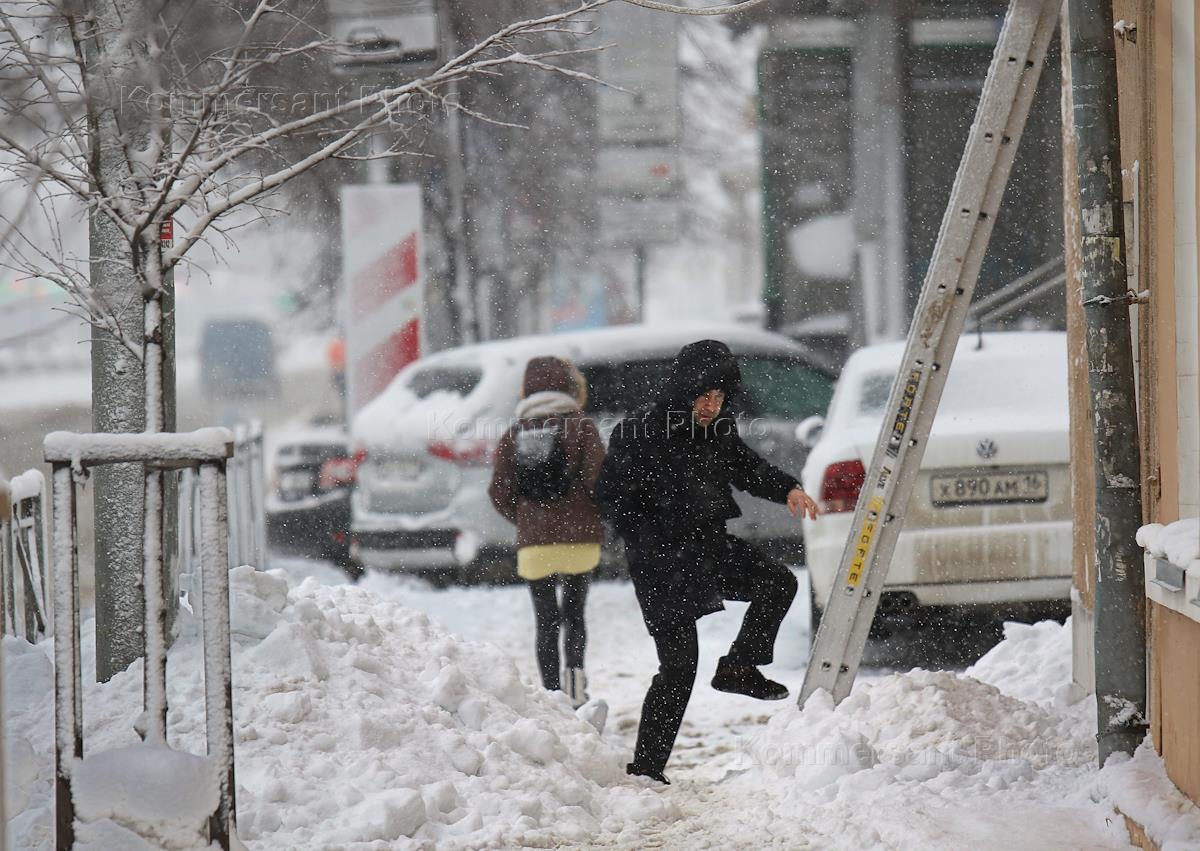 Виды Казани во время снегопада. Жанровая фотография. Курьер службы доставки сервиса "Яндекс. Лавка". Женщина помогает подняться подскользнувшемуся на проезжей части человеку.