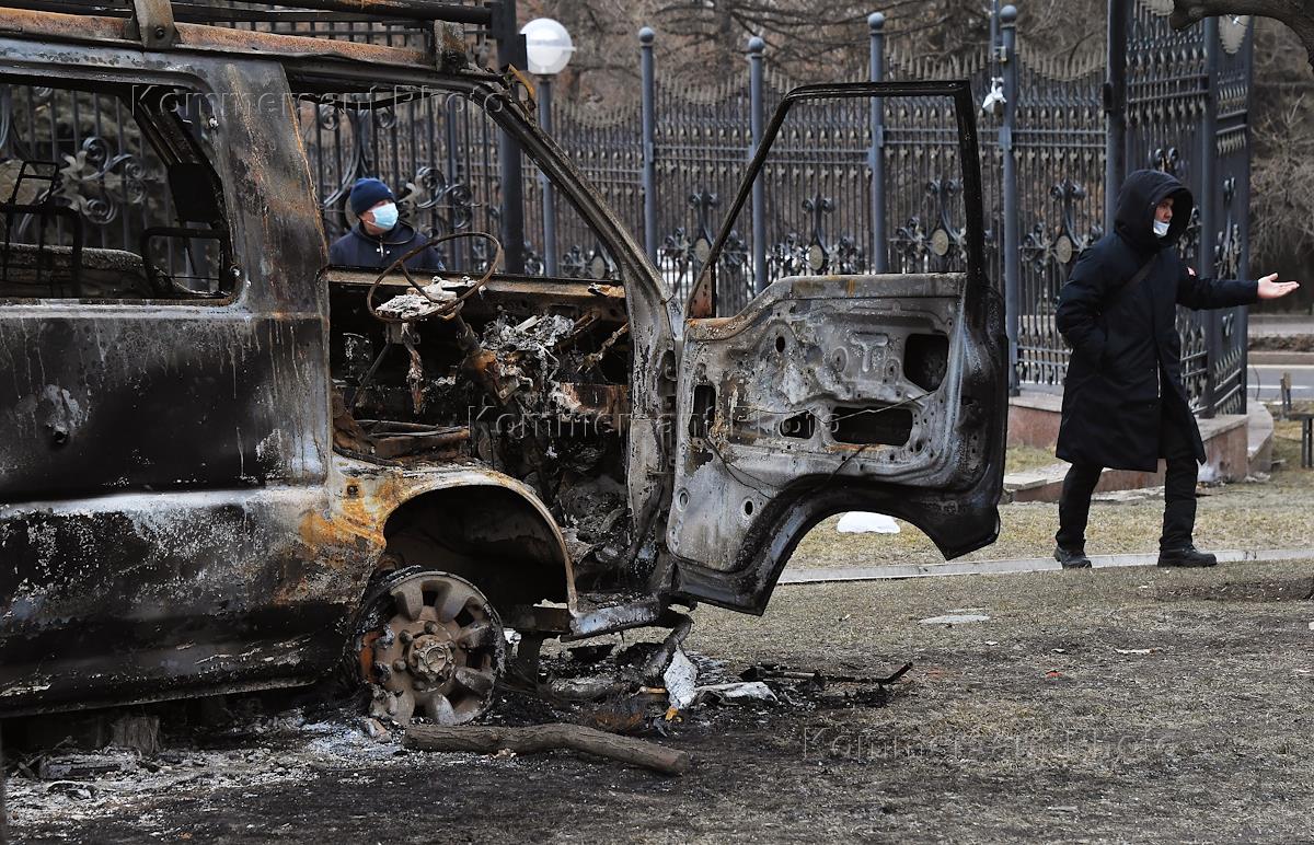 Политическая ситуация в Казахстане. Последствия массовых акций протеста из-за повышения цен на топливо. Сгоревший автомобиль.