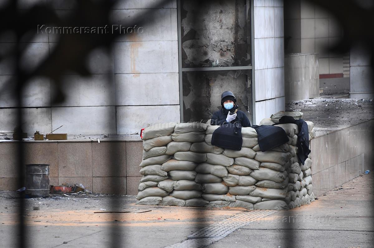 Политическая ситуация в Казахстане. Устранение последствий массовых акций протеста из-за повышения цен на топливо. Военнослужащий во время охраны здания.