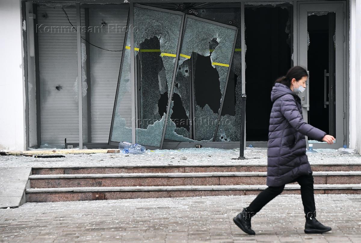 Политическая ситуация в Казахстане. Последствия массовых акций протеста из-за повышения цен на топливо. Разбитые стеклянные окна здания.