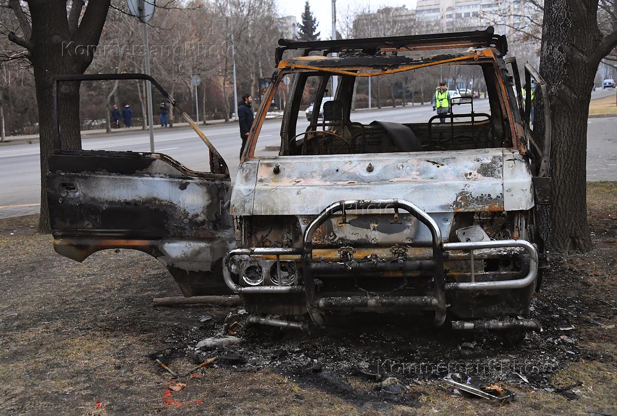 The political situation in Kazakhstan. Consequences of massive protests due to the increase in fuel prices. Burned-out car on a city street.