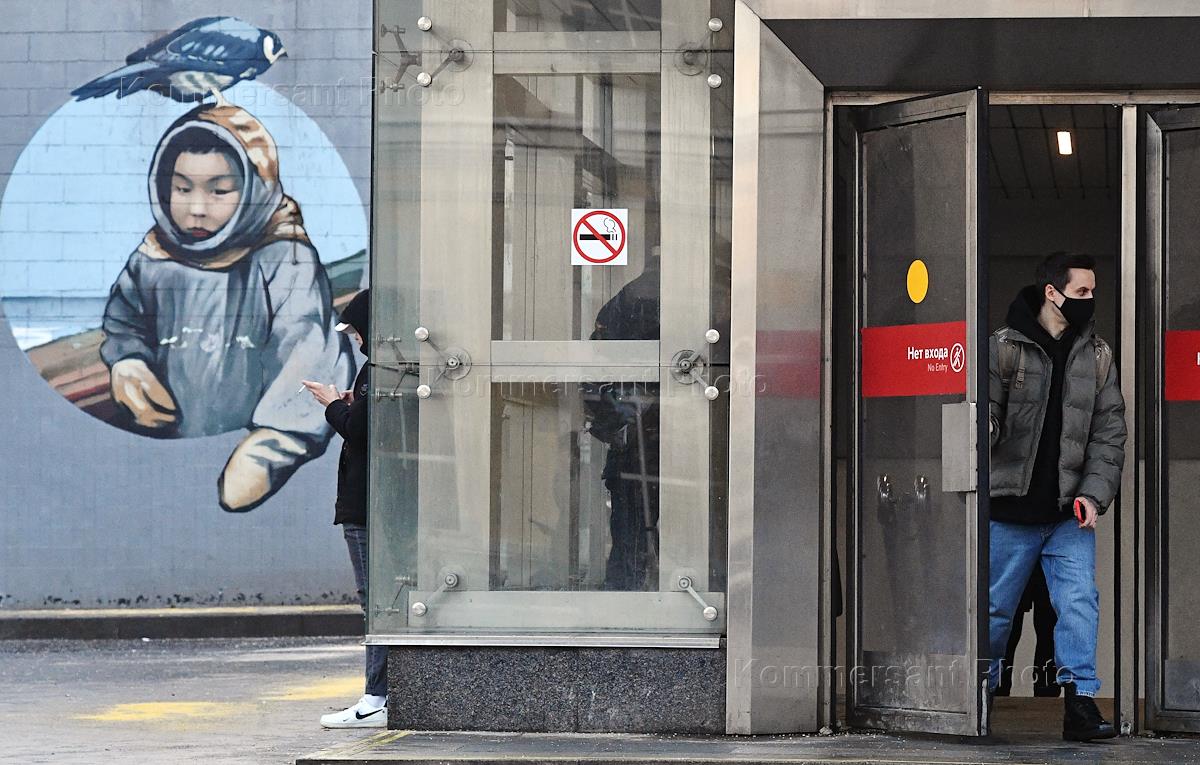 Views of Moscow during a snowfall. Genre photography. A man enters the entrance of a residential building.