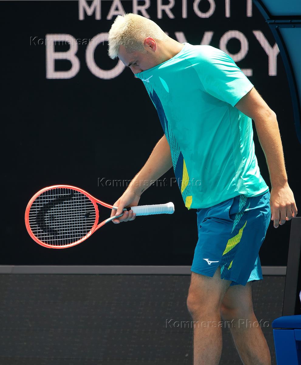 Теннисный турнир Australian Open-2022. Квалификационные игры. Австралийский теннисист Бернард Томич во время матча с российским теннисистом Романом Сафиуллиным.