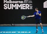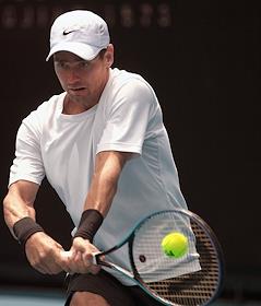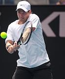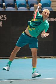 Теннисный турнир Australian Open-2022. Квалификационные игры. Австралийский теннисист Бернард Томич во время матча с российским теннисистом Романом Сафиуллиным.