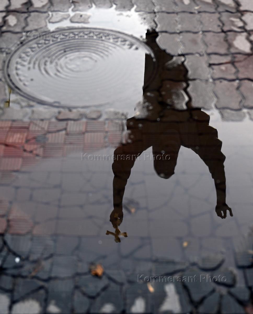 Жанровая фотография. Прохожие отражаются в луже на тротуаре набережной.