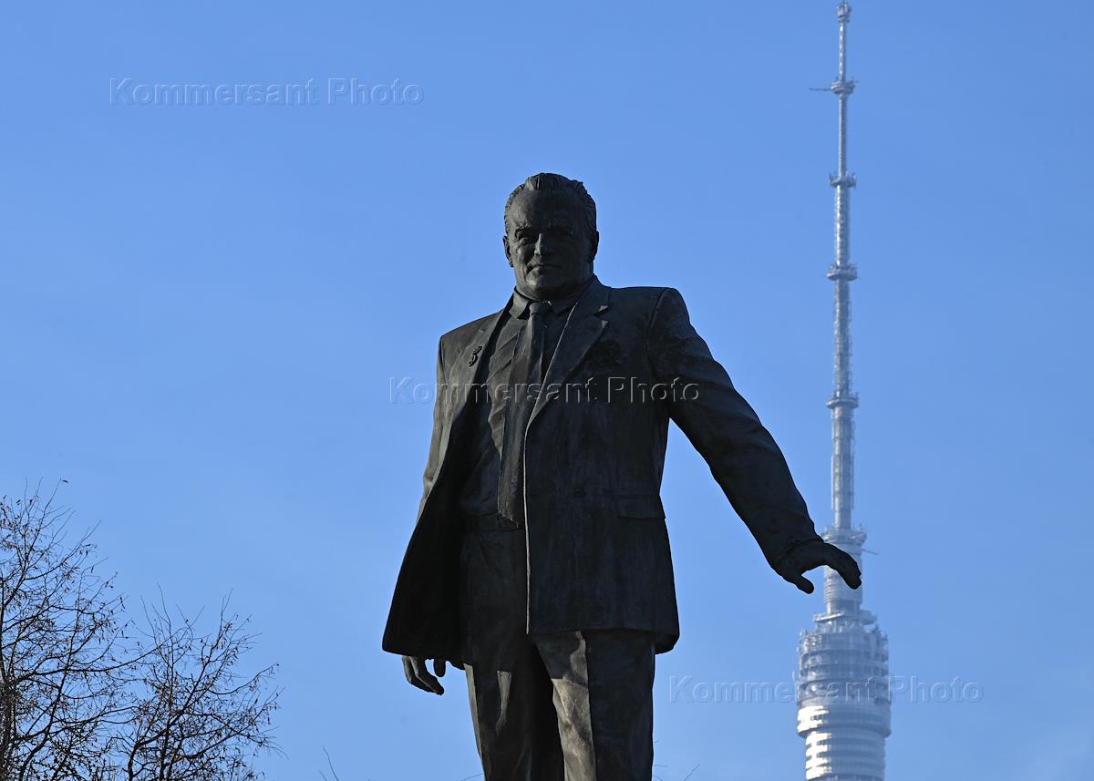 Виды Москвы. Жанровая фотография. Памятник конструктору космических кораблей Сергею Королеву на проспекте Мира на фоне Останкинской телебашне.