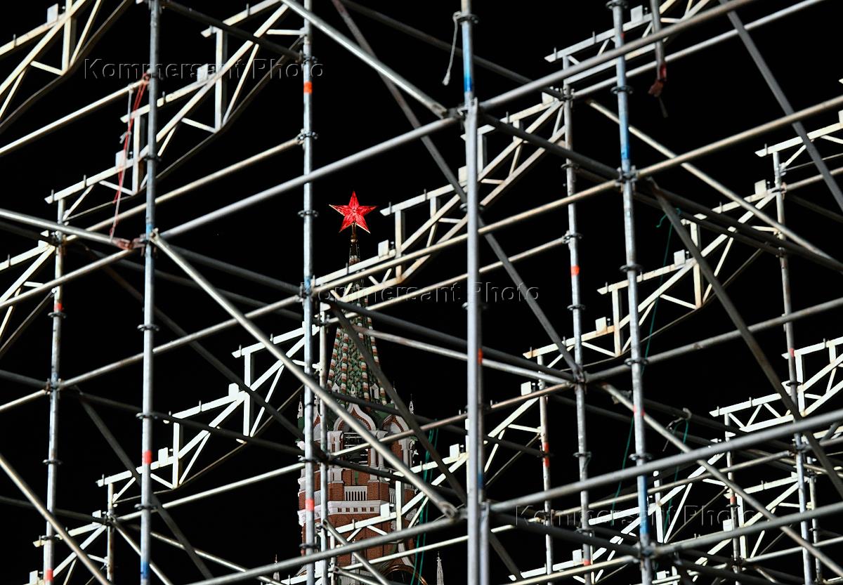 Жанровая фотография. Металлические конструкции зрительских трибун на Красной площади. Рубиновая звезда на башне Кремля.