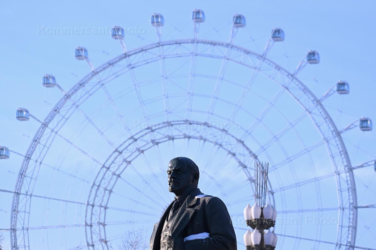 Виды Москвы. Жанровая фотография. Памятник основоположнику космонавтики Константину Циолковскому на Аллее Космонавтов, закрытый сеткой.