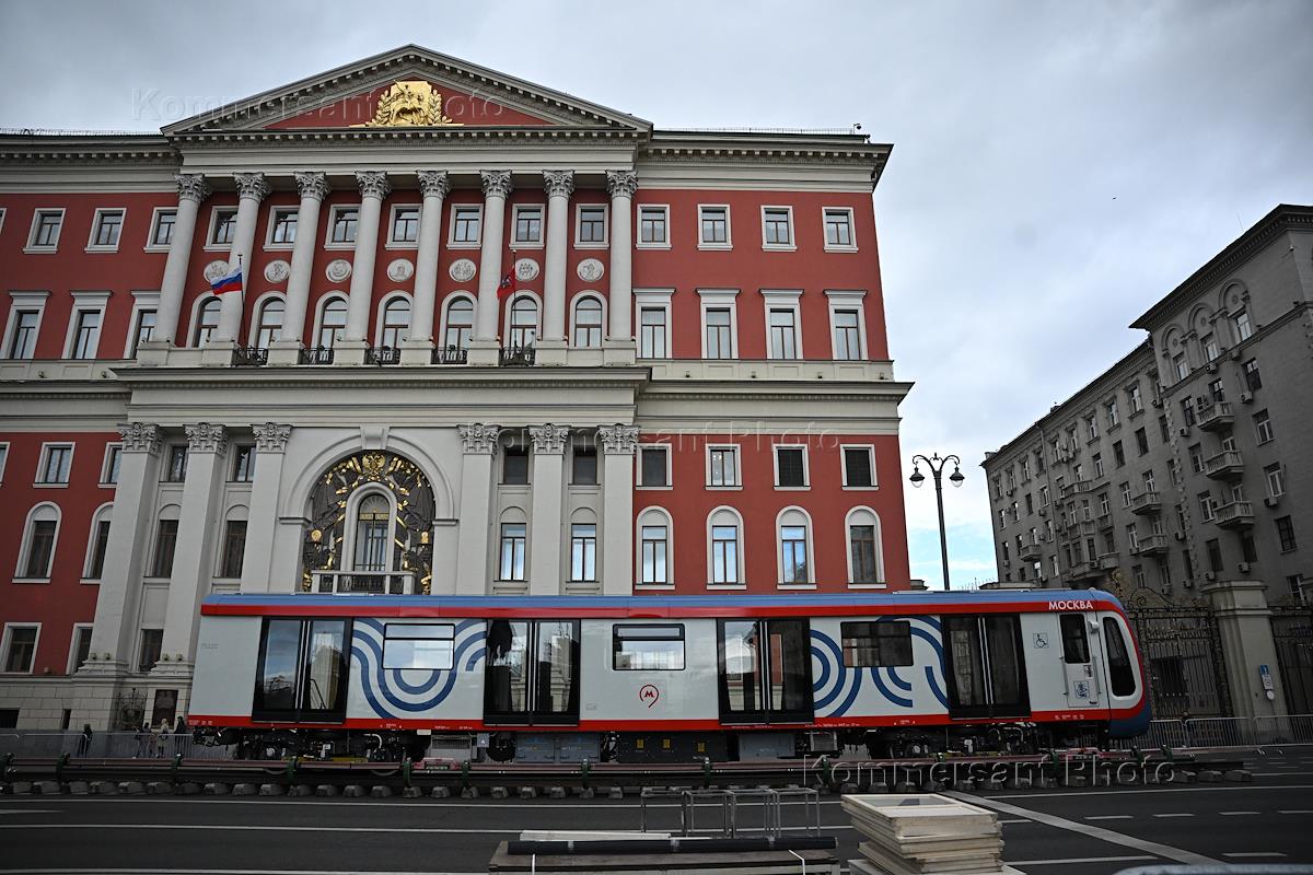 Жанровая фотография. Подготовка к празднованию Дня 875-летия города Москвы. Вагон метрополитена на Тверской улице у здания Мэрии Москвы.