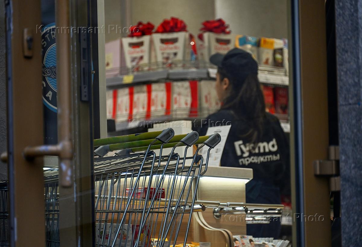 Views of Moscow. Genre photography. An employee of the Gusto hypermarket on Tverskaya Street in the trading floor.