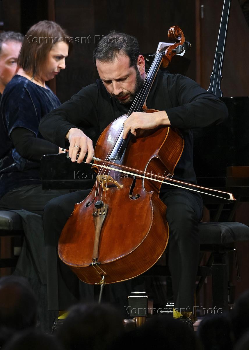 XXIV Chamber Music Festival "Return". Concert "Duma" in the Small Hall of the Moscow Conservatory. Cellist Boris Andrianov (right) and pianist Ksenia Bashmet (center) during a concert.