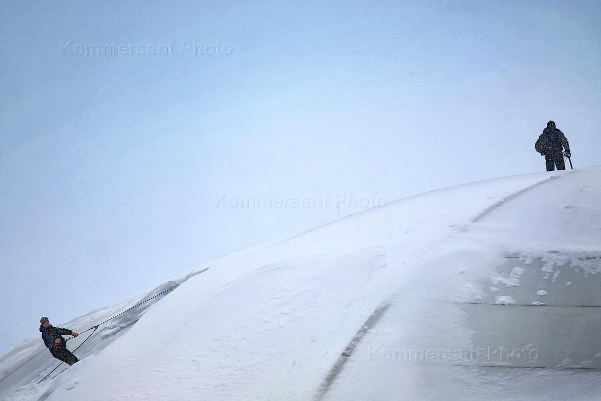 Виды Казани. Жанровая фотография. Уборка снега с крыши здания.