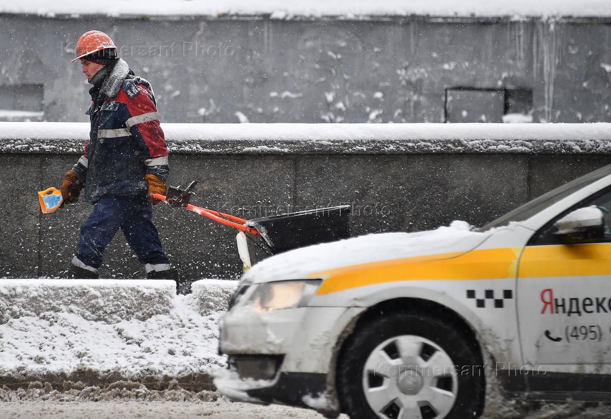 Genre photography. Employees of utilities during the cleaning of snow from the carriageway of the highway.