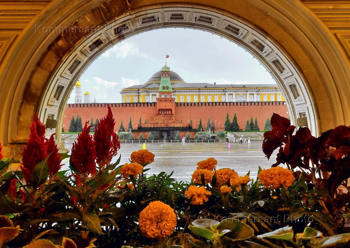 Виды Москвы. Кремль. Государственный Флаг России на куполе здания.