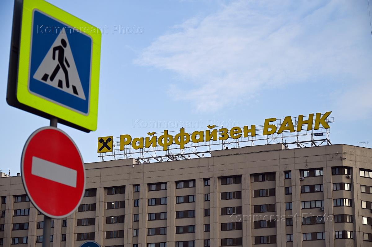 Views of Moscow. Genre photography. Advertising sign "Raiffeisen Bank" on the roof of the building.