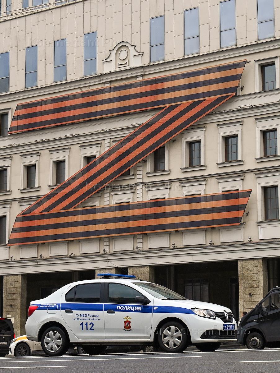 Genre photography. The building of the Moscow Theater of Oleg Tabakov and the sign "Z" in support of the special military operation of the Russian Armed Forces in Ukraine on the facade. Police car while driving on the highway.
