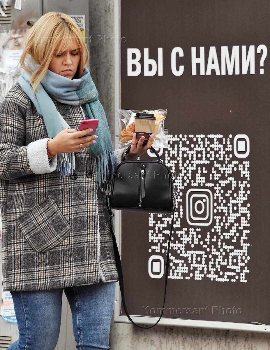 Меры противодействия распространению коронавирусной инфекции COVID-19 в Крыму. В регионе введены обязательные QR-коды с информацией о вакцинации и перенесенном заболевании или ПЦР-тест для посещения заведений общественного питания, торговых центров, спа-салонов, фуд-кортов, парикмахерских, саун, бассейнов, театров и кинотеатров. Жанровая фотография. Девушка с мобильным телефоном на фоне рекламного стенда с QR-кодом.