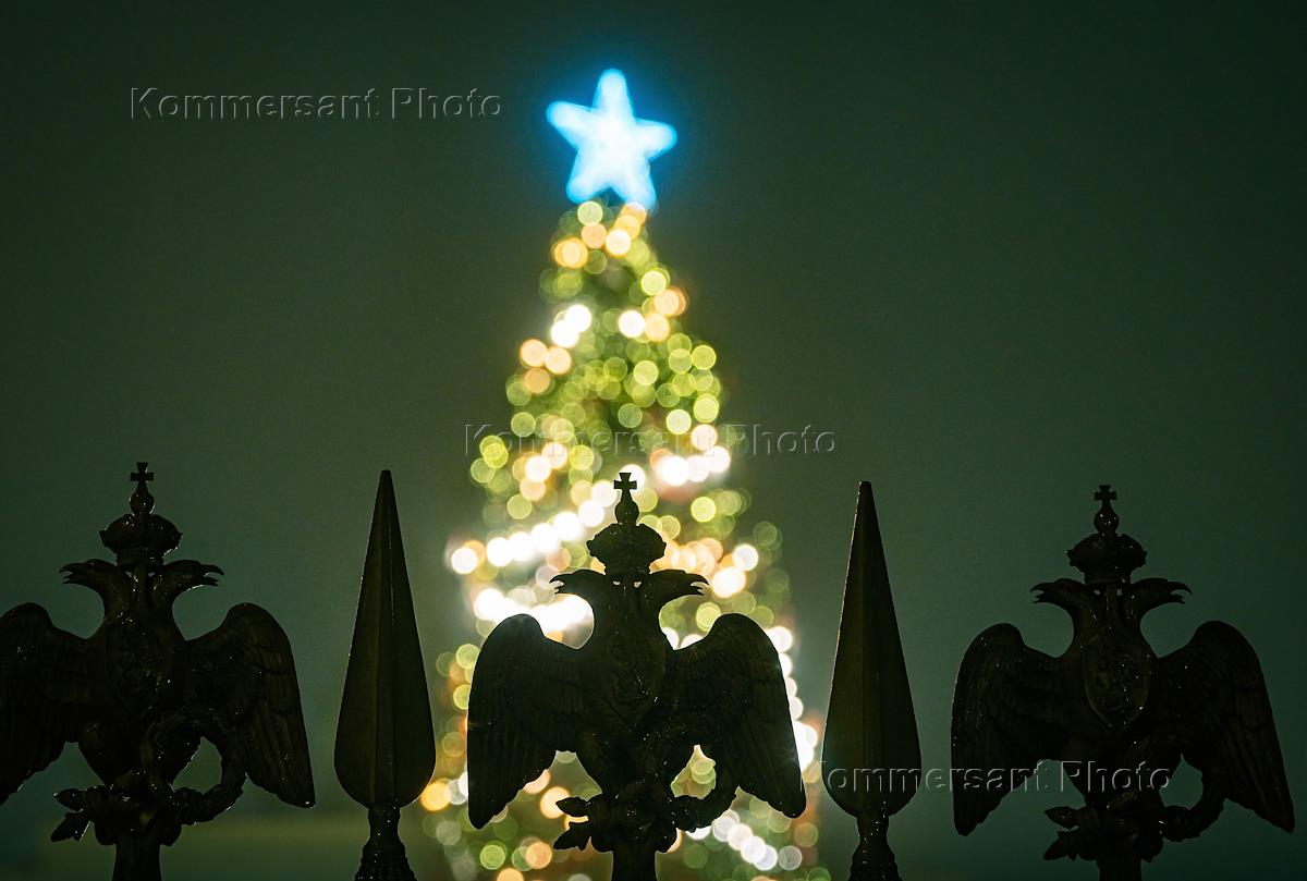 View of the evening St. Petersburg. Elements of the fence around the Alexandrian Column against the backdrop of the New Year tree on Palace Square.