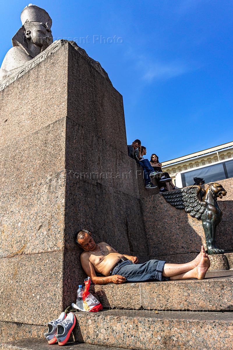 Views of St. Petersburg. Genre photography. A man is resting on the steps of the Sphinxes on University Embankment.