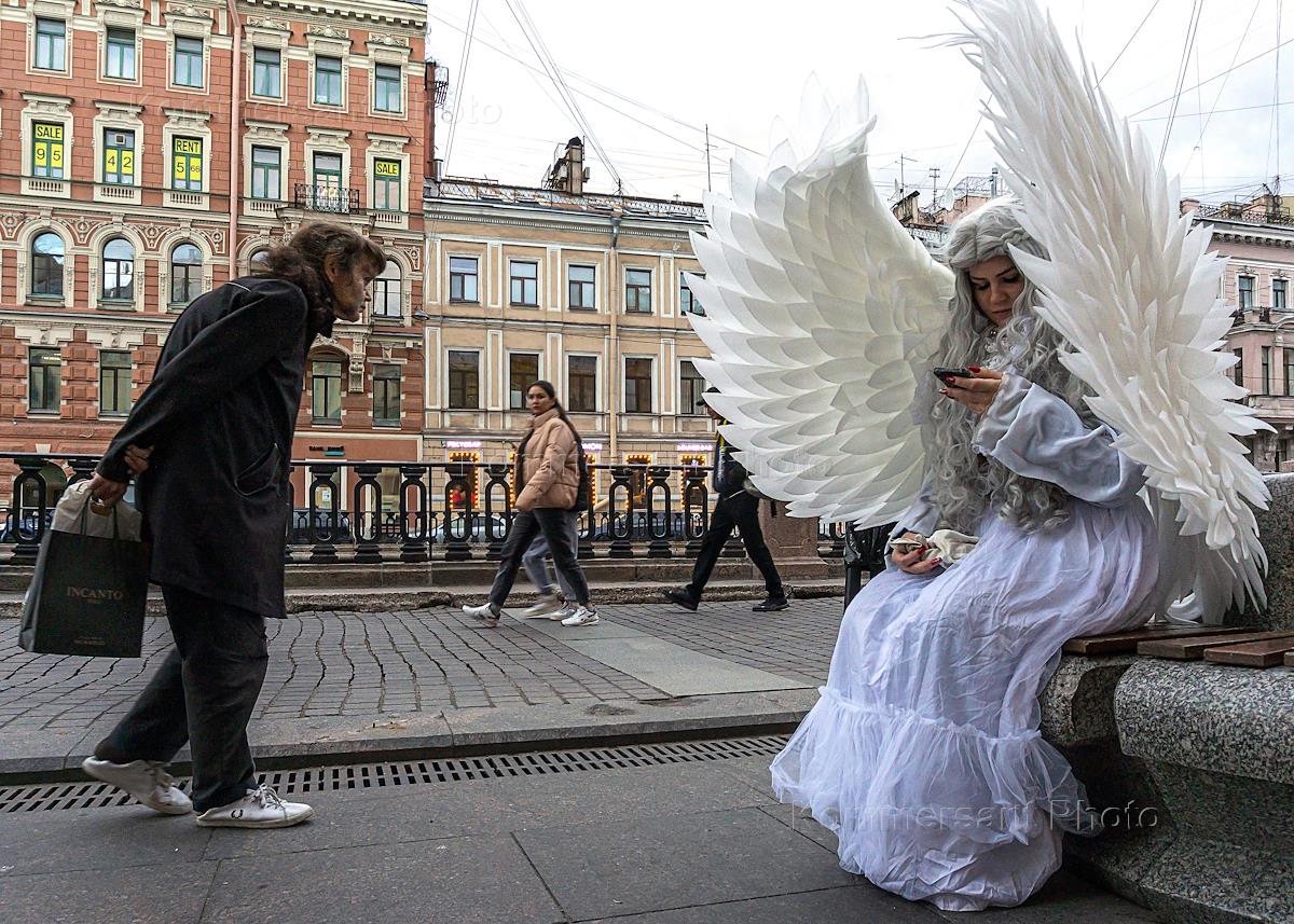 Views of St. Petersburg. Genre photography. A girl dressed as an angel on the embankment of the Griboyedov Canal.