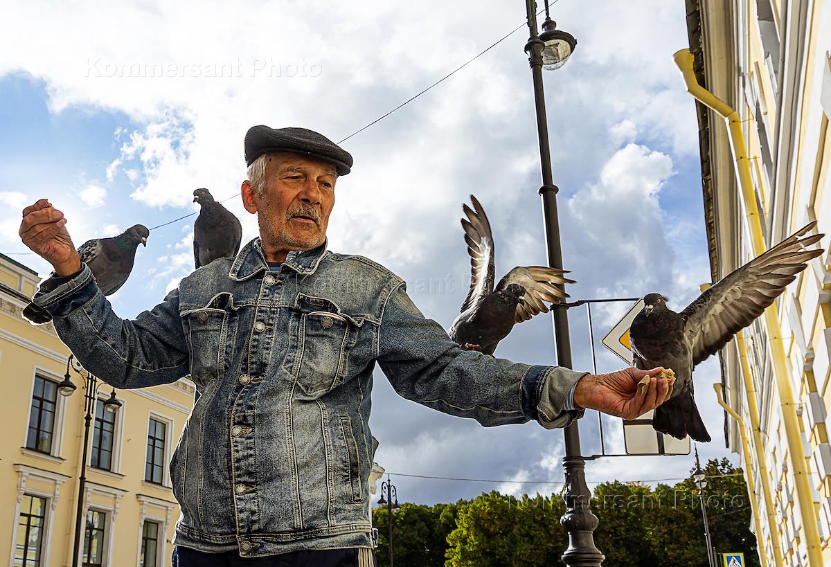 Виды Санкт-Петербурга. Жанровая фотография. Пожилой мужчина кормит голубей на улице Чайковского.