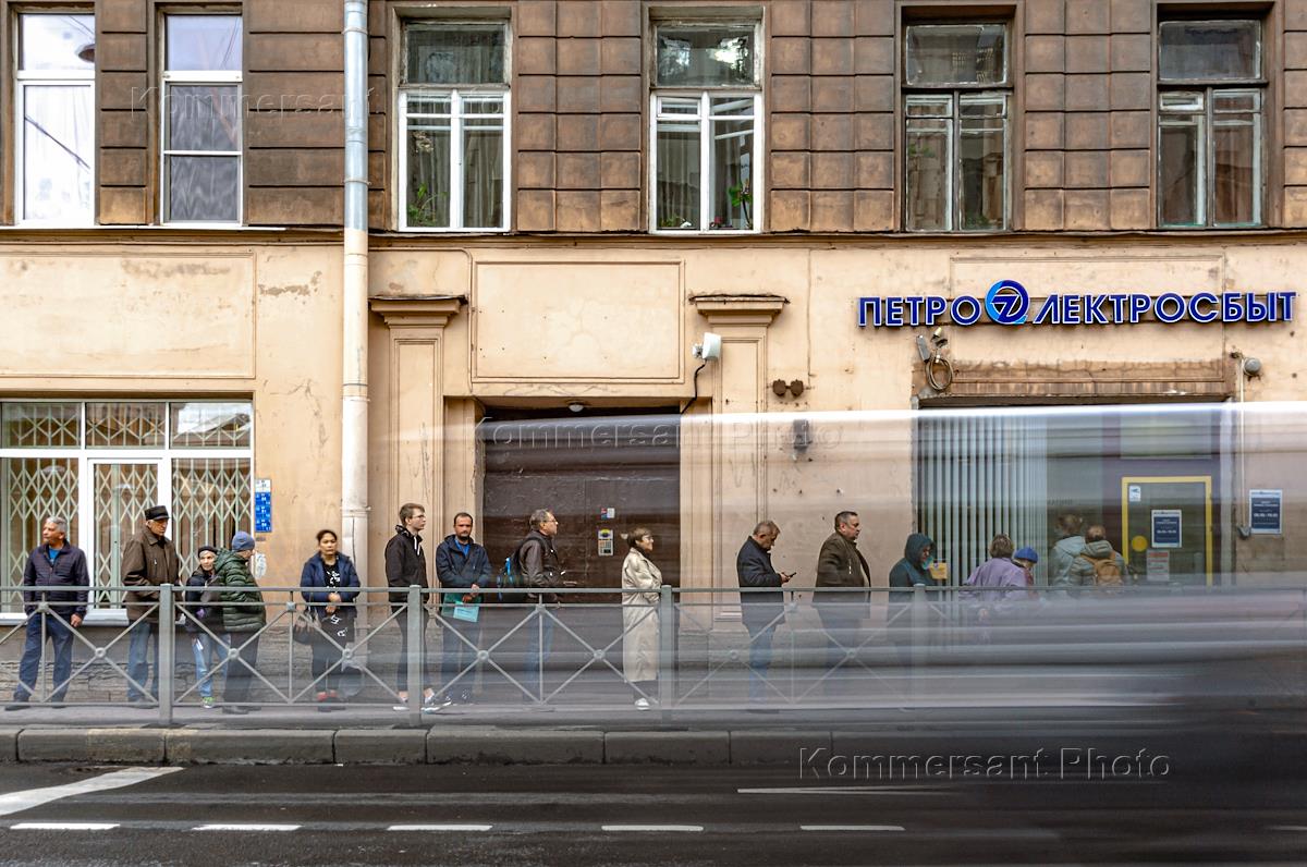 Views of St. Petersburg. Genre photography. The queue at the Petroelektrosbyt cash settlement center on Bolshaya Pushkarskaya Street.