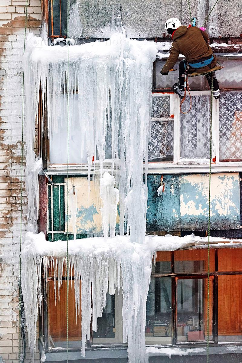 Виды Нижнего Новгорода зимой. Жанровая фотография. Уборка снега и льда с крыши жилого дома.