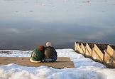 Жанровая фотография. Люди сидят на лавочке на набережной реки Волга.