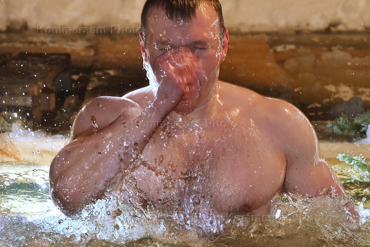 Праздник Крещения Господня. Священнослужитель во время обряда освящения проруби в пруду Зеленка.
