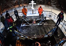 Праздник Крещения Господня. Крещенские купания в Нижнем Майском пруду (Олений пруд № 5) в парке "Сокольники". Чин великого освящения воды.