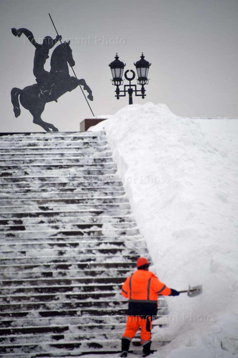 Genre photography. An employee of the municipal service of the city during snow removal on the square near the Central Museum of the Great Patriotic War of 1941-1945. on Poklonnaya Hill.