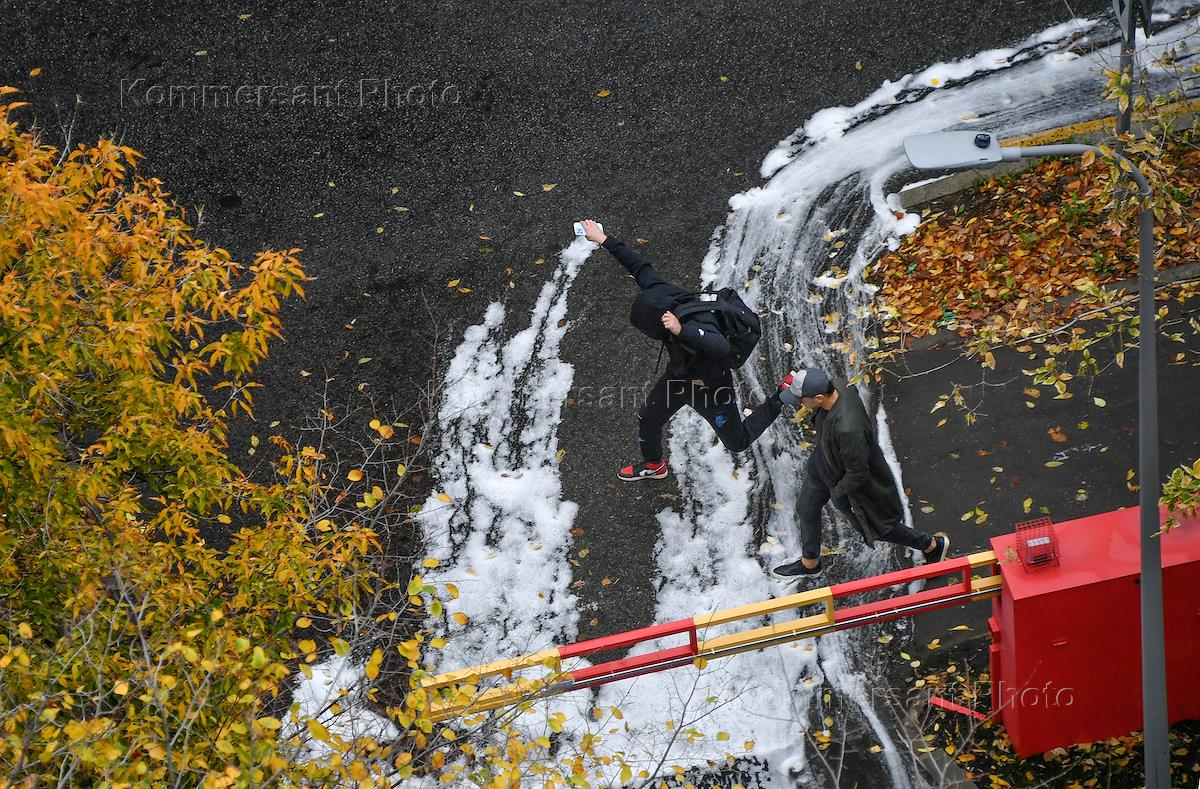 Views of Moscow. Genre photography. The guys jump over the foam on the pavement.
