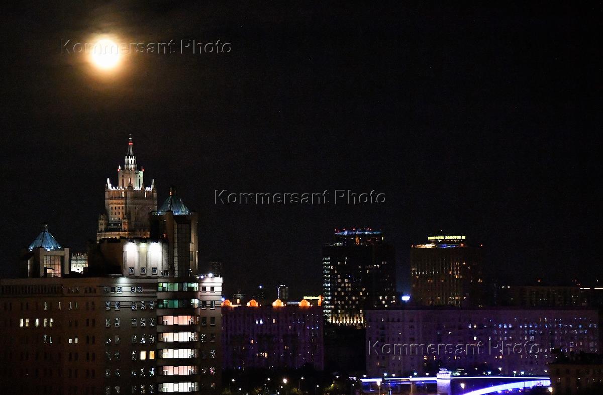 Views of Moscow. Genre photography. Full moon over the building of the Radisson Collection Hotel, Moscow (Radisson Collection Hotel) - the former hotel "Ukraine".