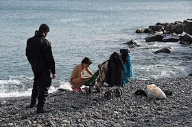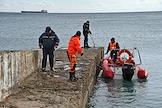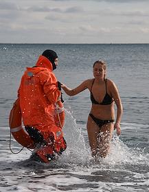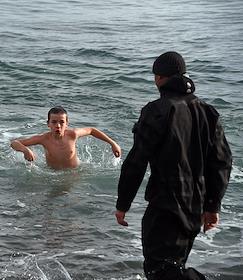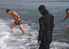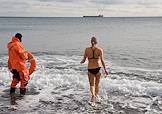 Праздник Крещения Господня. Крещенские купания в Черном море на пляже Алушты. Сотрудники спасательной службы во время дежурства на крещенских купаниях.