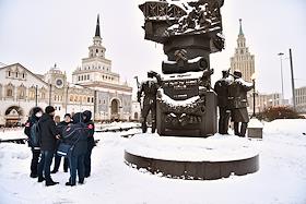 Проверка масочного режима на общественном транспорте. Сотрудники ГКУ "Организатор перевозок" возле памятника ветеранам Великой Отечественной войны — воинам спецформирований Народного комиссариата путей сообщения и труженикам тыла (Монумент железнодорожникам) на Комсомольской площади.