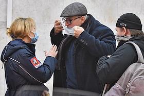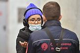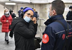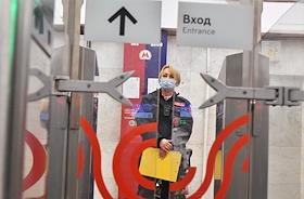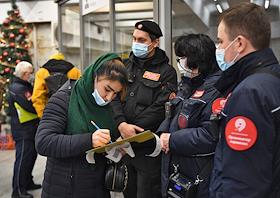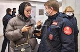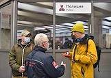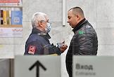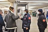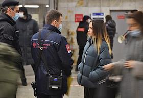 Проверка масочного режима на общественном транспорте. Сотрудники ГКУ "Организатор перевозок" во время проверки в вестибюле станции метро "Пушкинская".