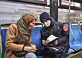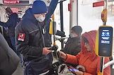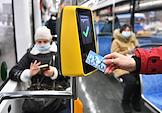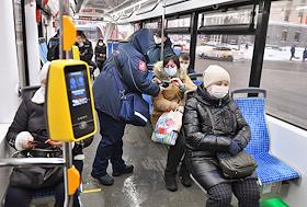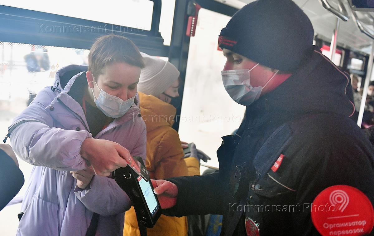Проверка масочного режима на общественном транспорте. Жанровая фотография. Пассажир трамвая во время оплаты проезда картой "Тройка".