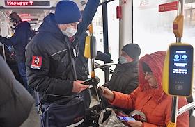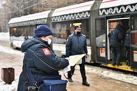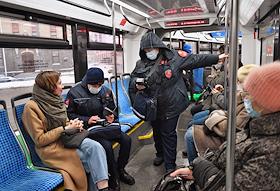 Проверка масочного режима на общественном транспорте. Сотрудники ГКУ "Организатор перевозок" во время проверки в трамвае.