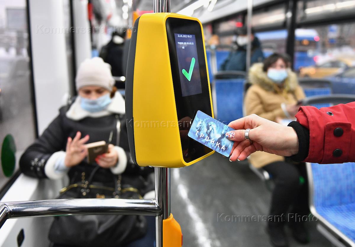 Проверка масочного режима на общественном транспорте. Жанровая фотография. Пассажир трамвая во время оплаты проезда картой "Тройка".