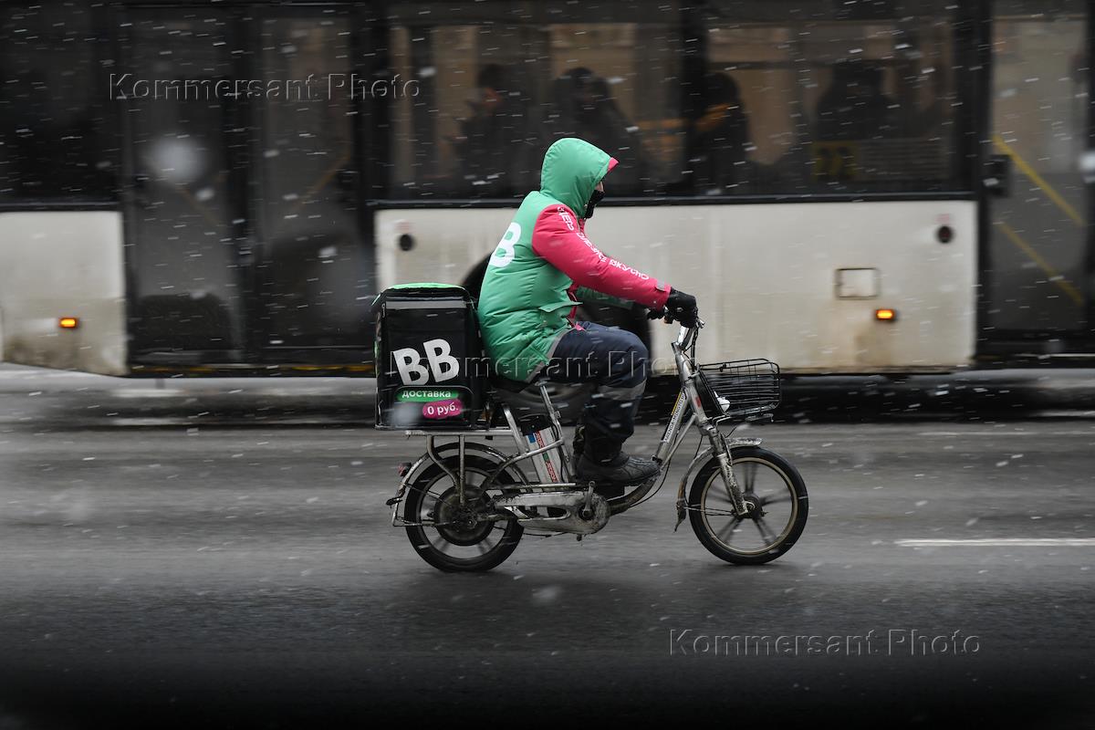 Snow in St. Petersburg. Genre photography. A food delivery courier with a bicycle on a pavement that has not been cleared of snow.