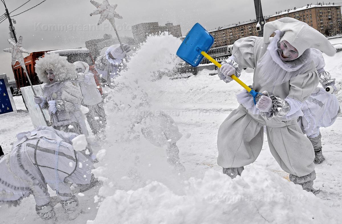 Снегопад в Москве. Жанровая фотография. Уличные артисты в парке Горького имитируют расчистку снега детскими лопатками.