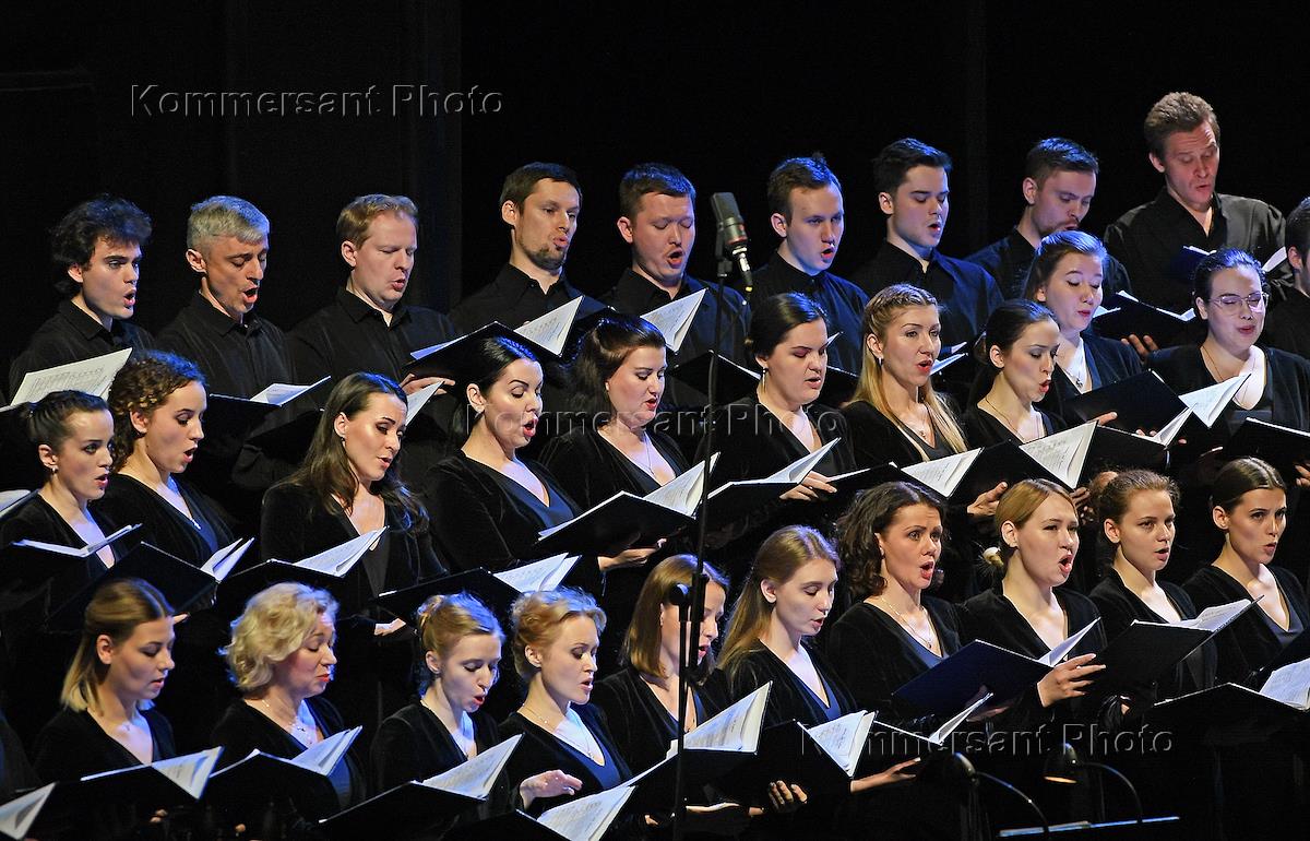 Epiphany Festival. Concert "Benjamin Britten. Kaya Saariaho" on the stage of the theater "Novaya Opera". The cycle Sacred & Profane ("Spiritual and mundane") is a composition by Britten for unaccompanied choir. Conductor Yulia Sinyukova (right) during a concert.